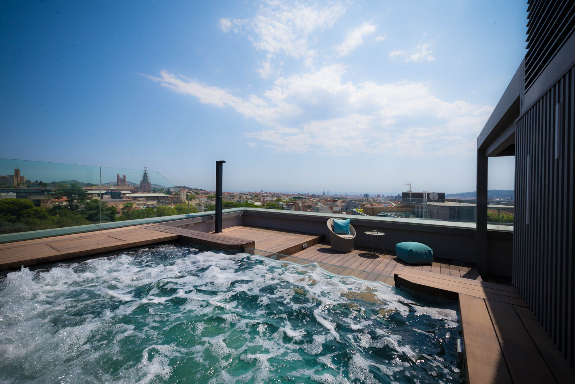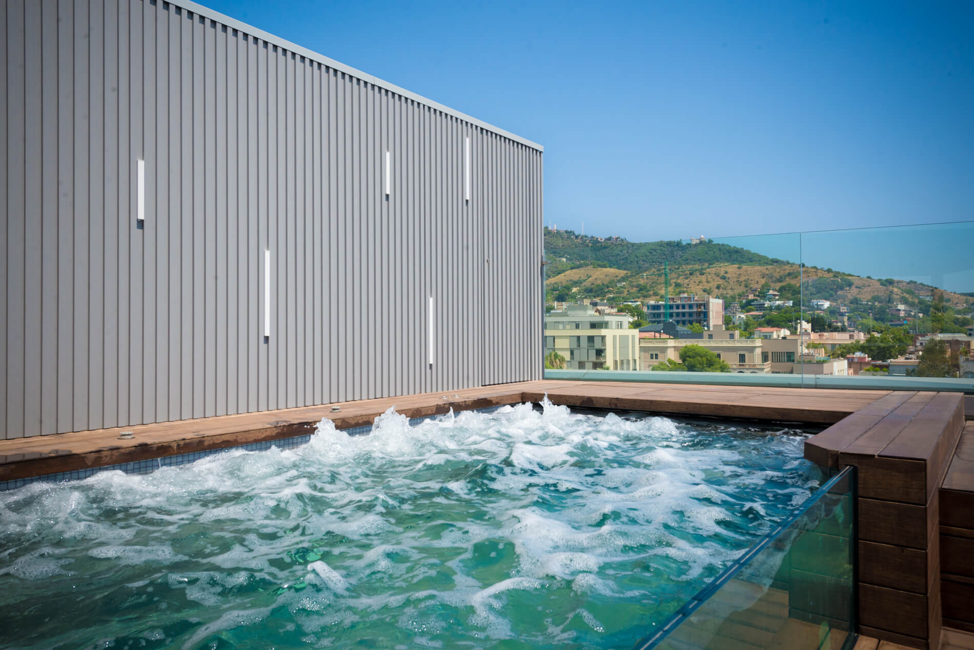 La pieza central del proyecto es una piscina personalizada, construida mediante bloques modulares de poliestireno expandido de alta densidad, que incorpora una espectacular pared de cristal y un área wellness equipada con chorros de masaje, brindando una experiencia de relajación única.