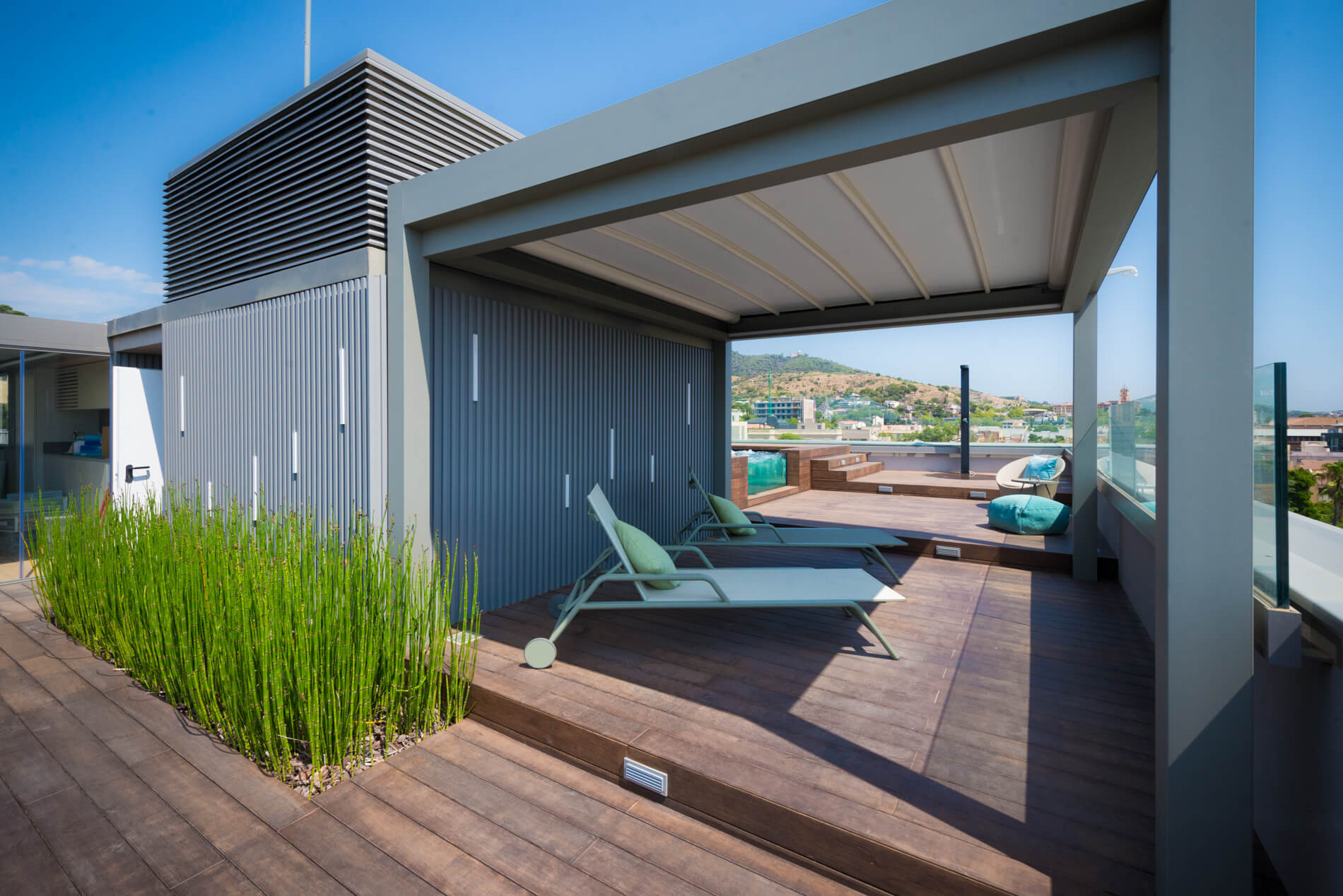 Las zonas cubiertas cuentan con tres estructuras exclusivas que ofrecen protección sin comprometer el diseño: la Renson Skye con lamas retráctiles, la elegante Algarve Canvas y la sofisticada Corradi Maestro Pergotenda, cada una aportando carácter propio y funcionalidad avanzada.