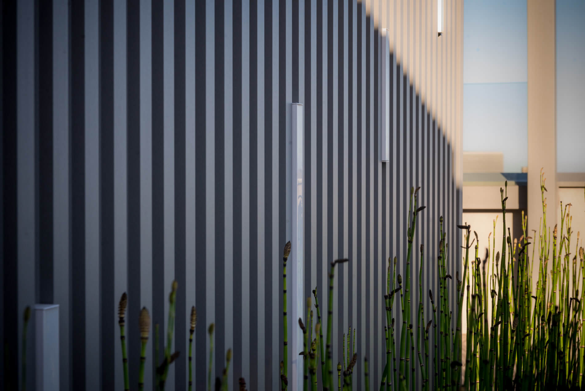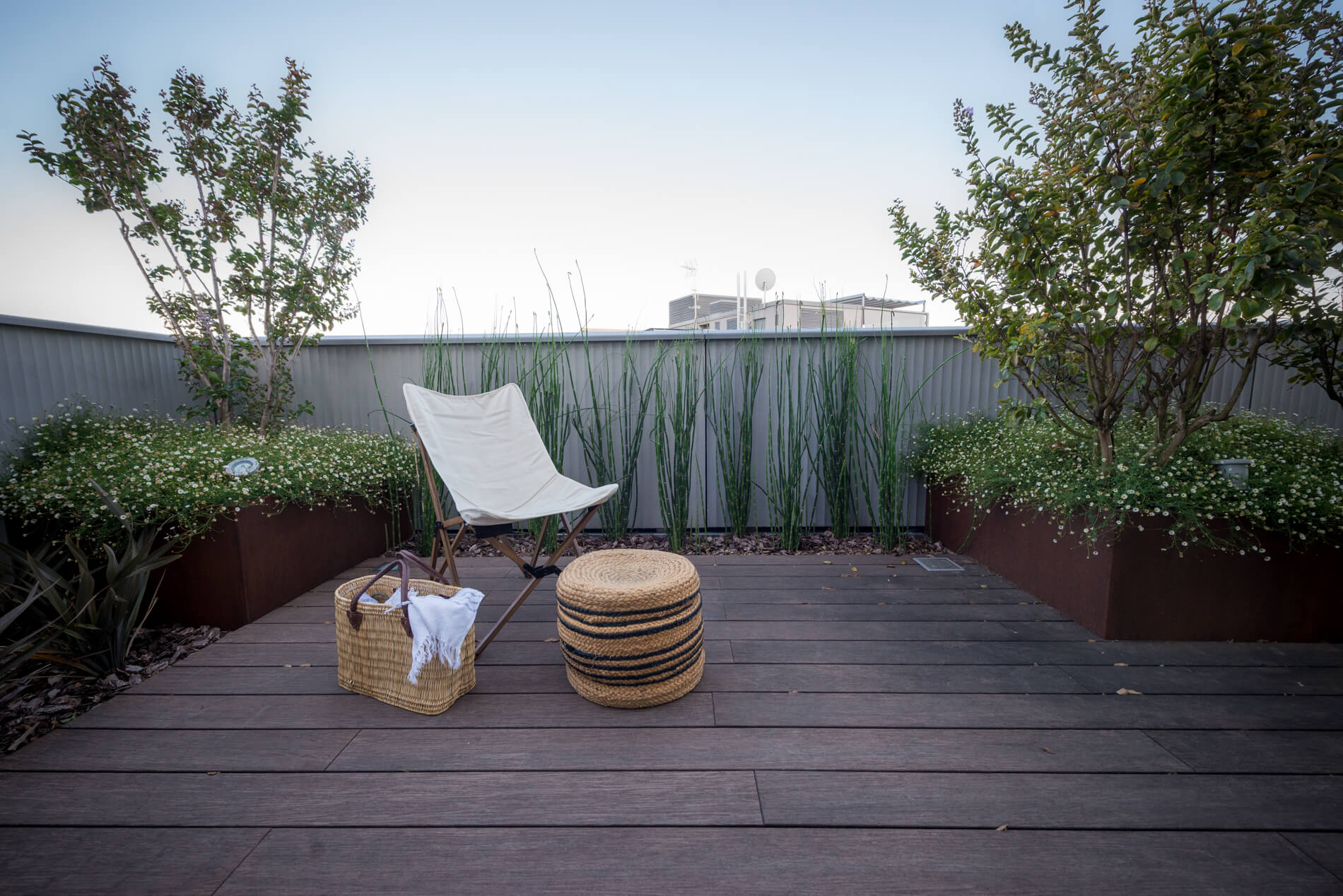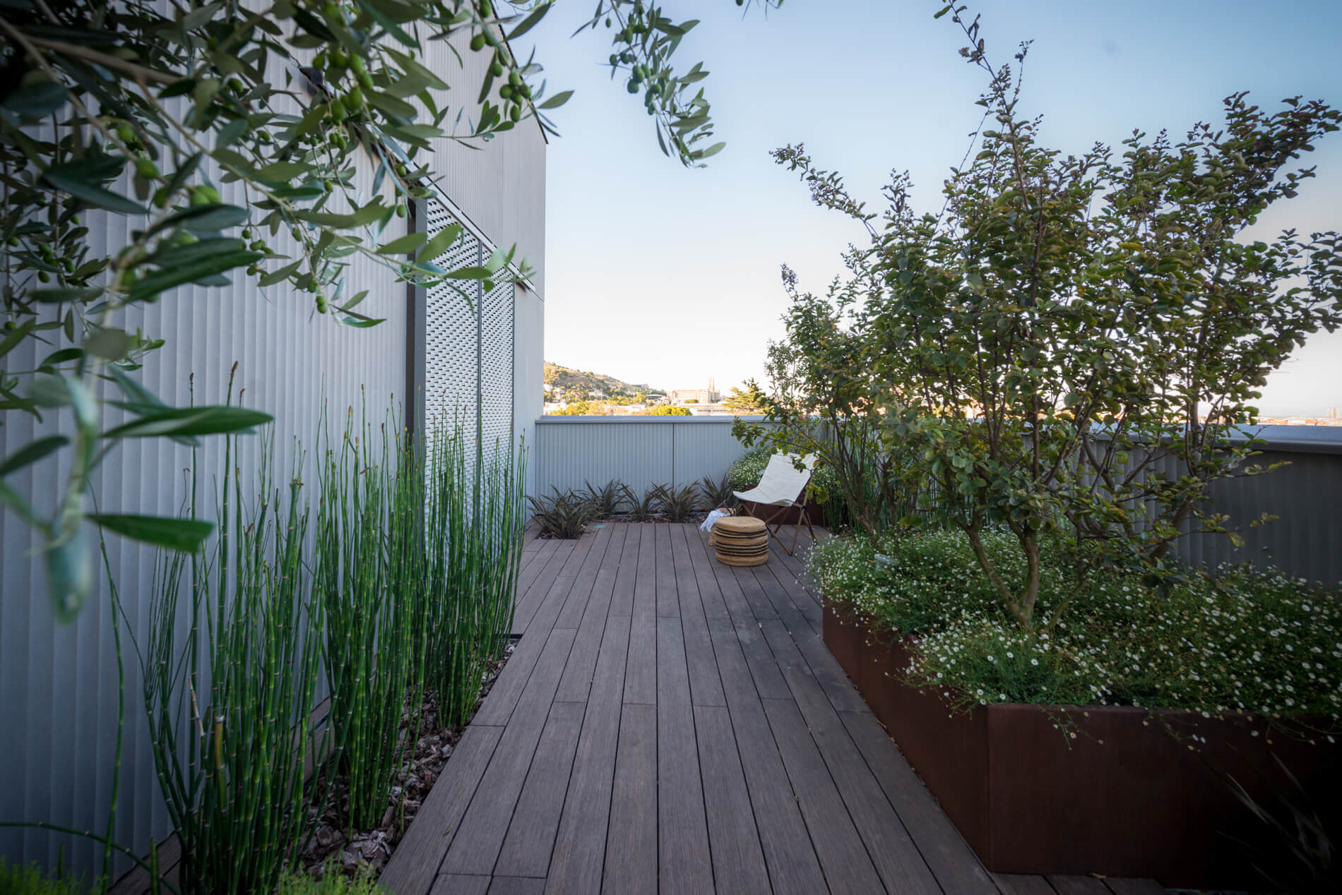 Las jardineras de acero corten, diseñadas a medida para este proyecto, albergan una cuidadosa selección de especies como Lagerstroemia indica, Pennisetum rubrum, Equisetum hyemale, Vittadinia y Eugenia Newport, aportando color, textura y frescura natural al espacio.