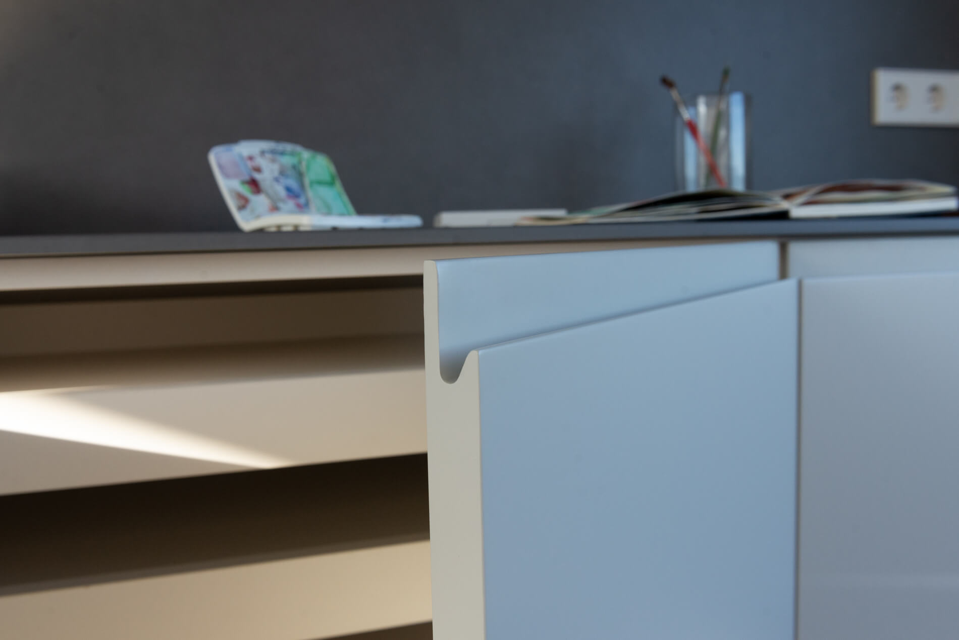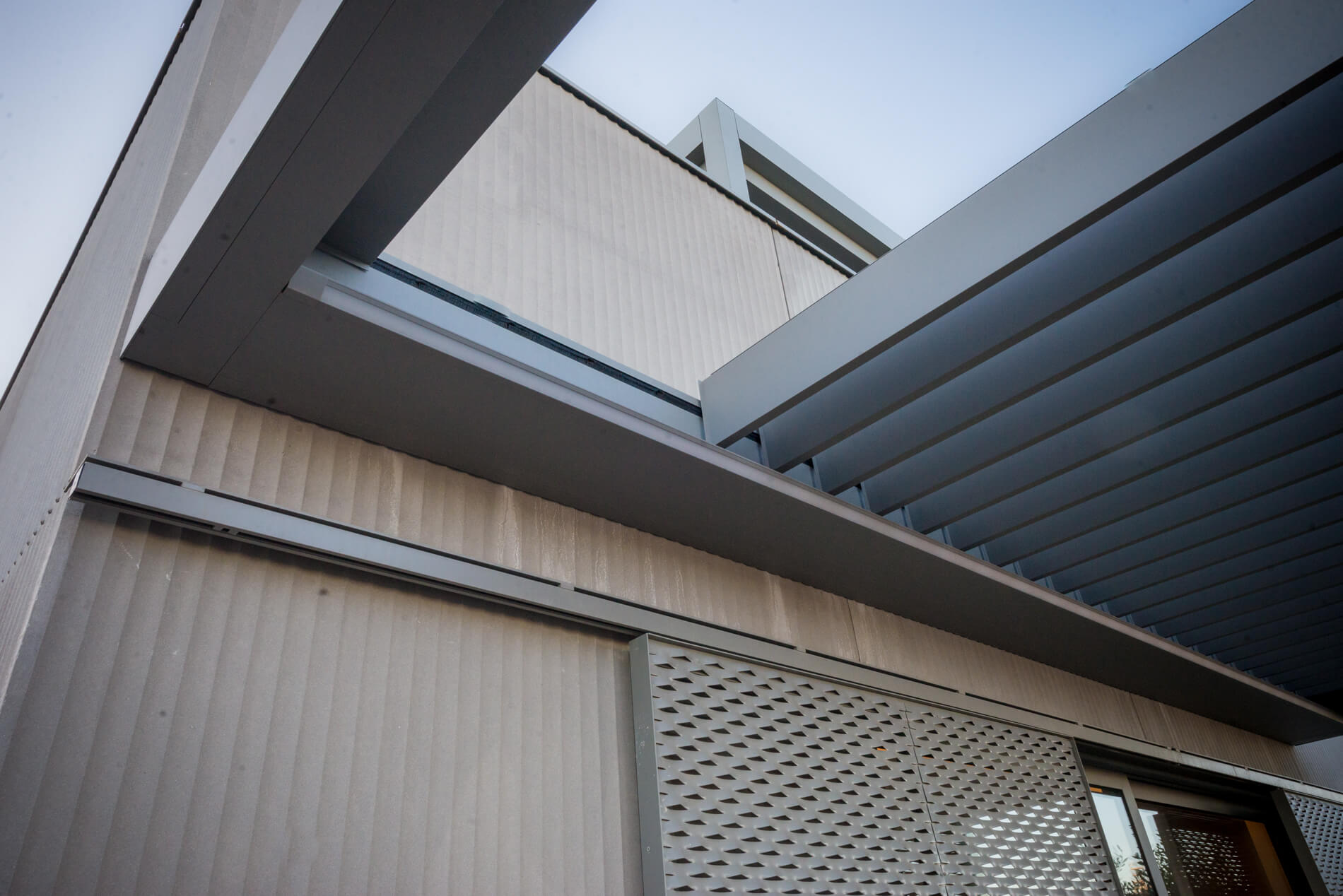 Las paredes exteriores se visten con el sistema Linarte Bloc 30 de Renson, que incorpora iluminación LED integrada, aportando profundidad visual, elegancia y un juego lumínico sutil y moderno.