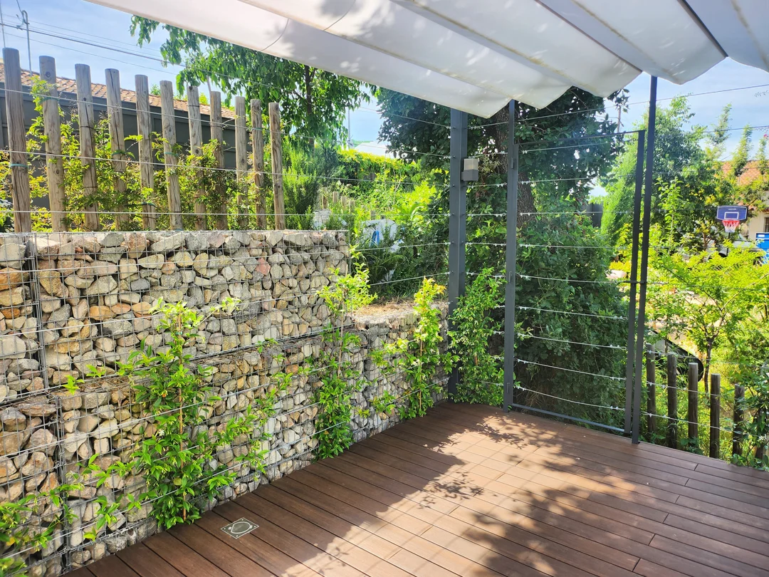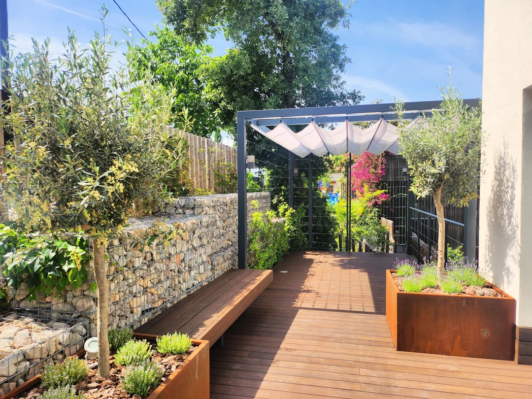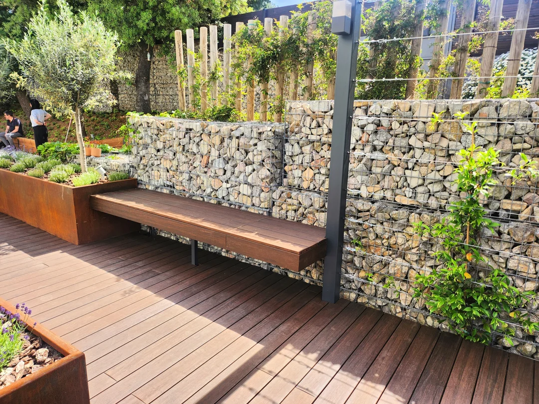 Los muros de gaviones rellenos de piedra caliza aportan textura, estabilidad y un atractivo visual auténticamente mediterráneo, creando un contraste armonioso con el resto de elementos del diseño.