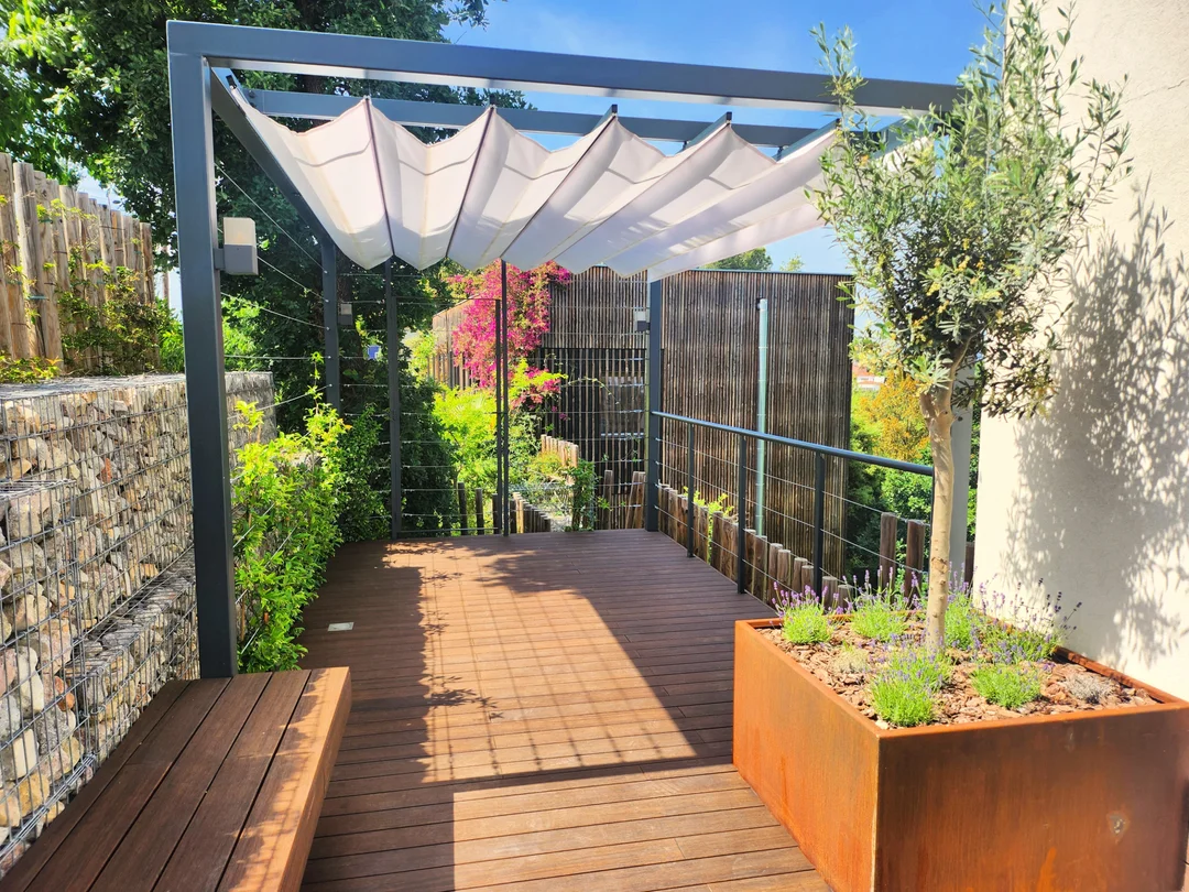 Una pérgola de acero con estructura de toldos de ondas, de accionamiento manual y tejido acrílico resistente a la lluvia, ofrece protección y confort, aportando un estilo relajado y funcional al entorno.